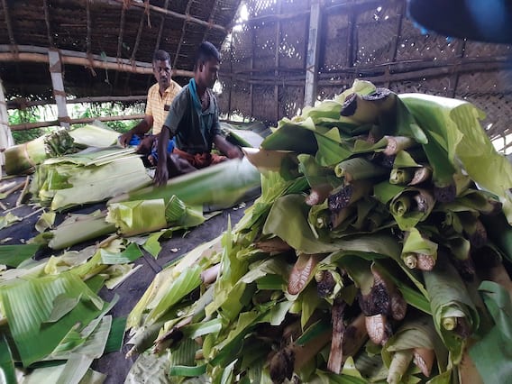 இரண்டு ரூபாய்க்கு வியாபாரிகள் கொள்முதல் செய்கிறார்கள். தற்போது திருவையாறு உட்பட பகுதிகளில் மழை விட்டு விட்டு பெய்வதால் குறைந்த விலைக்கு கூட கொள்முதல் செய்ய வியாபாரிகள் அச்சப்பட்டு முன் வருவதில்லை. இதனால் 3 நாட்களாக அறுக்கப்பட்ட இலைகள் அப்படியே அடுக்கி வைக்கப்பட்டு தேக்கமடைந்து உள்ளது.
