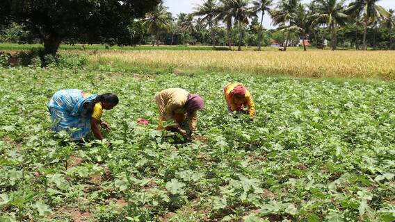 தஞ்சாவூர்: தஞ்சை அருகே காராமணித்தோப்பு பகுதியில் வெண்டைக்காய் சாகுபடியில் களை எடுக்கும் பணியில் விவசாய தொழிலாளர்கள் மும்முரமாக ஈடுபட்டனர்.