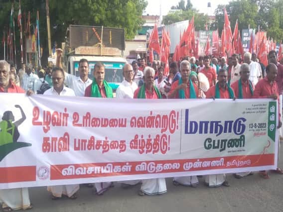 தஞ்சாவூர்: விவசாயிகளின் விளை பொருட்களுக்கு குறைந்தபட்ச ஆதார விலையை நிர்ணயம் செய்ய வேண்டும் என்று தஞ்சாவூரில் நடைபெற்ற விவசாயிகள் விடுதலை முன்னணி மாநாட்டில் தீர்மானம் நிறைவேற்றப்பட்டது. விவசாயிகள் விடுதலை முன்னணி சார்பில் விவசாயிகளின் பிரதான கோரிக்கைகளை முன்வைத்து பேரணியும், மாநாடும் நடைபெற்றது. இந்திய நாடு மிகப் பிரதானமாக விவசாய நாடாகும். நாட்டின் முதுகெலும்பாக விவசாயிகள் இன்று வரை திகழ்து வருகின்றனர். ஆனால் நாடு விடுதலை பெற்ற சுமார் 75 ஆண்டு காலமாக விவசாயிகள் வாழ்க்கையில் எந்தவித முன்னேற்றமும் இல்லை. உணவு உற்பத்தியில் மிகப்பெரிய சாதனைகளை செய்து நாட்டு மக்கள் அனைவரும் பசியாற தினந்தோறும் பாடுபட்டு வருகின்றனர். இருப்பினும் விவசாயிகளின் பொருளாதார நிலை மட்டும் இன்னும் உயரவே இல்லை. விவசாயிகள் விளைவிக்கின்ற விளைபொருட்களுக்கு கட்டுப்படியான விலை கிடைக்காததால் சிறு, குறு விவசாயி முதல் பெரிய விவசாயிகள் வரை அனைவரும் பாதிக்கப்பட்டுள்ளனர். அவர்களின் வாழ்க்கை நிலைமையில் மாற்றம் வேண்டும். விவசாயத்தில் முன்னேற்றம் வேண்டும். விவசாயிகளின் வாழ்வாதாரம் மேம்பட வேண்டும் என்பன போன்ற கோரிக்கைகளை வலியுறுத்தி விவசாயிகள் விடுதலை முன்னணி சார்பில் தஞ்சாவூர் ரயில் நிலையத்திலிருந்து பேரணி புறப்பட்டது. பேரணியில் கோரிக்கைகளை வலியுறுத்தி கோஷங்கள் எழுப்பப்பட்டன. பேரணி தஞ்சை பழைய பேருந்து நிலையம் மாநகராட்சி திடல் வந்தடைந்து மாநாடு பொதுக்கூட்டம் நடைபெற்றது. இந்த கூட்டத்திற்கு விவசாயிகள் விடுதலை முன்னணி மாநில ஒருங்கிணைப்பாளர் கம்பம் மோகன் தலைமை வகித்தார். மாவட்ட அமைப்பாளர் ராமலிங்கம் கொடியேற்றினார். பொருளாளர் ராவணன் வரவேற்புரை நிகழ்த்தினார். தாளாண்மை உழவர் இயக்க தலைவர் கோ.திருநாவுக்கரசு, சமவெளி விவசாயிகள் இயக்க ஒருங்கிணைப்பாளர் பழனிராஜன், தமிழக விவசாயிகள் சங்கம் சின்னதுரை ஆகியோர் முன்னிலை வகித்தனர். மக்கள் அதிகாரத்தின் மாநில பொருளாளர் காளியப்பன், மக்கள் கலை இலக்கிய கழக மாநில இணைச்செயலாளர் ராவணன், புதிய ஜனநாயக தொழிலாளர் முன்னணி மாநில தலைவர் பழனி, மாநில பொதுச் செயலாளர் அன்பு தமிழ்நாடு விவசாயிகள் சங்கம் மாநிலச் செயலாளர் சாமி. நடராஜன், தமிழ்நாடு விவசாய சங்க மாநில செயலாளர் மாசிலாமணி, அகில இந்திய விவசாயிகள் மகாசபை மாநில பொதுச் செயலாளர் சந்திரமோகன் ஆகியோர் வாழ்த்துரை வழங்கினர். ஐக்கிய விவசாயிகள் முன்னணியின் தேசிய ஒருங்கிணைப்பு குழு உறுப்பினர் புருஷோத்தம் சர்மா, பெங்களூரு உயர் நீதிமன்ற வழக்கறிஞர் பாலன், விவசாயிகள் விடுதலை முன்னணி மாநில பொருளாளர் செல்வராஜ் ஆகியோர் மாநாட்டின் நோக்கங்கள் குற