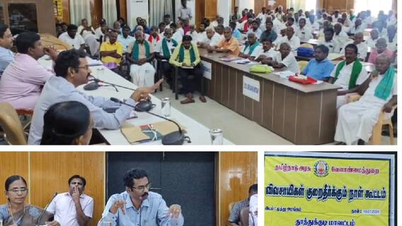 தூத்துக்குடி மாவட்ட ஆட்சியர் அலுவலக கூட்ட அரங்கில் ஜூலை மாதத்திற்கான விவசாயிகள் குறைதீர்க்கும் நாள் நடைபெற்றது. தூத்துக்குடி மாவட்ட ஆட்சியர் லட்சுமிபதி தலைமையில் நடைபெற்ற கூட்டத்தில், வேளாண்மை இணை இயக்குனர் (பொ)சாந்தி ராணி, ஆட்சியரின் நேர்முக உதவியாளர் மனோரஞ்சிதம், பொதுப்பணித்துறை கோரம்பள்ளம் மற்றும் கீழ் தாமிரபரணி வடிநில கோட்ட செயற்பொறியாளர் வசந்தி, மேல்தாமிரபரணி வடிநில கோட்ட செயற்பொறியாளர் மதன சுதாகர் உள்ளிட்டோர் கலந்து கொண்டனர்.
