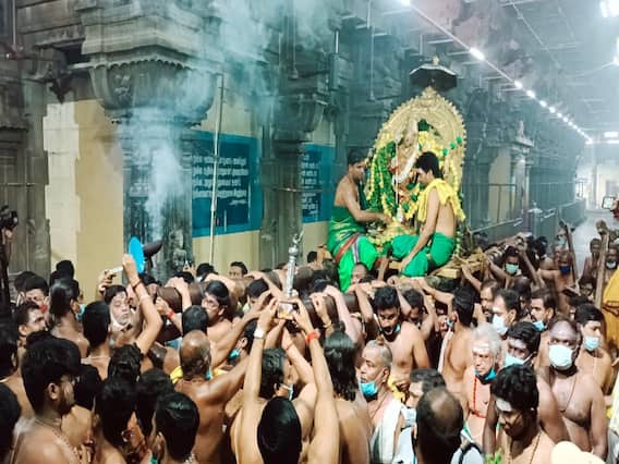 தொடர்ந்து பகல் 12 மணியளவில் 108 மகாதேவர் சன்னதி முன்பிருந்து சுவாமி சண்முகர் பச்சை நிற பட்டாடை உடுத்தி, மரிக்கொழுந்து மற்றும் பச்சை நிற மாலை அணிந்து பச்சை சாத்தி அலங்காரத்தில் கேடயச் சப்பரத்தில் எழுந்தருளி உள்பிரகாரத்தில் சுற்றி வந்து தனது இருப்பிடம் சேர்ந்தார். இதில் பங்கேற்க பக்தர்களுக்கு அனுமதி அளிக்கப்படவில்லை. முக்கிய நிர்வாகிகள் மட்டுமே கலந்து கொண்டனர். இந்த நிகழ்ச்சி இணையதளம் வழியாக நேரடியாக ஒளிபரப்பு செய்யப்பட்டது.