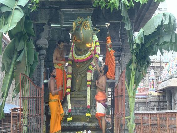 கொரோனா தொற்று காரணமாக பக்தர்கள் இன்றி அம்மாவாசை பிரதோஷம் சமூக இடைவெளி உடன் எளிமையாக நடைபெற்றது. திருக்கோயில் நிர்வாகத்தின் சார்பாக பிரதோஷ கால பூஜை சமூக இடைவெளி விட்டு திருக்கோயில் சிவாச்சாரியார்கள் எளிமையான முறையில வேத மந்திரங்கள் முழங்க பூஜை நந்தி பகவானுக்கு நடைபெற்றது.