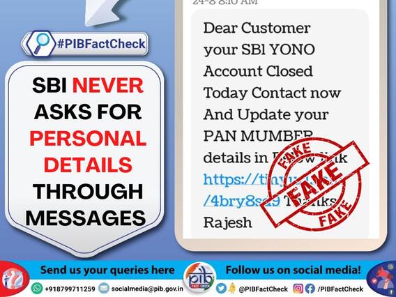 இது குறுத்து பி.ஐ,பி. வெளியிட்டுள்ள டிவிட்டரில், எஸ்.பி.ஐ. தனது வாடிக்கையாளர்களிடம் தனிப்பட்ட தகவல்களை மெசேஜ் மூலம் கேட்காது என்று குறிப்பிட்டுள்ளது.