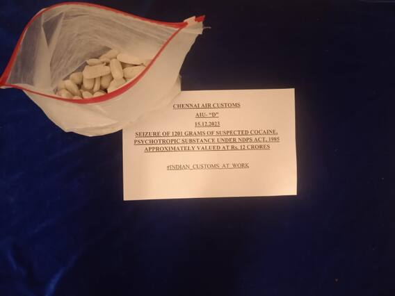 12 கோடி ரூபாய் மதிப்பிலான 1.2 கிலோ தடை செய்யப்பட்ட கொகைன் போதை பொருளை சென்னை விமான நிலைய சுங்கத்துறையினர் பறிமுதல் செய்துள்ளனர்
