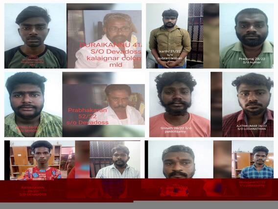 இந்நிலையில் கைது செய்யப்பட்ட நபர்களில் 18 வயது பூர்த்தியடையாத காரணத்தால் சிறுவனைத் தவிர மீதமுள்ள 12 பேரை மயிலாடுதுறை நீதித்துறை நடுவர் 2 திருமதி கலைவாணி முன்பு நேற்று இரவு ஆஜர்படுத்தினர். அவர்களை 14 நாட்கள் காவலில் வைக்க நீதிபதி உத்தரவிட்டார். மீதமுள்ள குற்றவாளிகளை தேடிவரும் காவல்துறையினர் 18 வயது நிரம்பாத சிறுவனை சீர்திருத்த பள்ளியில் அடைப்பதற்காக நீதிமன்றத்தில் தனியே இன்று ஆஜர் படுத்த உள்ளதாக காவல் துறை அதிகாரிகள் தெரிவித்துள்ளனர். இச்சம்பவத்தில் தொடர்புடைய துரைக்கண்ணு மார்க்சிஸ்ட் கம்யூ. கட்சியின் நகர செயலாளர் என்பதும் அவரது உடன் பிறந்த சகோதரரான பிரபாகரன் விடுதலை சிறுத்தைகள் கட்சியின் முன்னாள் நகர செயலாளர் என்பதும் குறிப்பிடத்தக்கதாகும். குற்றம் சாட்டப்பட்டவர்கள் நீதிபதி முன்பு ஆஜர் படுத்துவதற்காக பலத்த பாதுகாப்புடன் கொண்டுவரப்பட்டனர். இதனைத் தொடர்ந்து நீதிபதி குடியிருப்புகள் முன்பு பலத்த போலீஸ் பாதுகாப்பு இன்ஸ்பெக்டர் செல்வம் தலைமையில் ஏற்படுத்தப்பட்டிருந்தது.