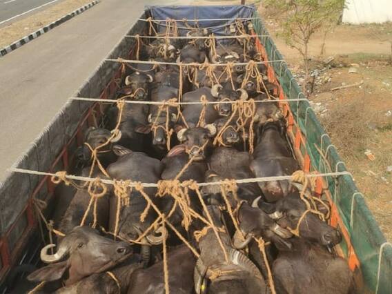 ஆந்திர மாநிலம் விஜயநகரத்தை சேர்ந்த ரோஸ் காளி நாயுடு என்பவருக்கு சொந்தமான லாரி ஒன்று ஆந்திர மாநிலம், சிலக்கலூர் பேட்டையில் இருந்து 30 எருமைகளை சட்டவிரோதமாக பொள்ளாச்சி சந்தைக்கு கொண்டு சென்று அங்கிருந்து கேரளாவிற்கு அடிமாட்டுக்காக கொண்டு சென்ற லாரி கரூர் - திருச்சி தேசிய நெடுஞ்சாலையில் வந்து கொண்டிருந்தது.