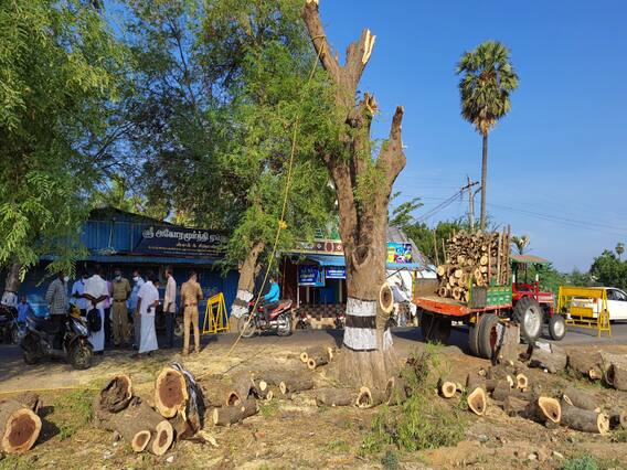 மயிலாடுதுறை மாவட்டம் சீர்காழி அருகே தென்பாதியில் தனியார் பெட்ரோல் விற்பனை நிலையம் அமைக்கும் பணிகள் நடைபெற்று வருகிறது. பெட்ரோல் பங்க் அமைப்பதற்கு சீர்காழி, மயிலாடுதுறை நெடுஞ்சாலையோரம் உள்ள அரசுக்கு சொந்தமான 50 ஆண்டுகள் பழமையான நான்கு புளிய மரங்கள் இடையூறாக உள்ளது என்று, அதனை வெட்டி எடுத்து அப்புறப்படுத்தும் பணியில் சிலர் ஈடுபட்டனர்.