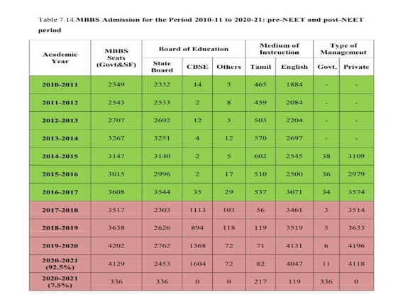 இந்த அறிக்கையில் 2010-ஆம் ஆண்டு முதல் மருத்துவ படிப்பில் நடைபெற்ற மாணவர் சேர்க்கையையும், கடந்தாண்டு நடைபெற்ற மாணவர் சேர்க்கை வரை ஒப்பிட்டு வெளியிடப்பட்டுள்ளது. நீட் தேர்வு வருகைக்கு பிறகு தமிழ்நாட்டில் உள்ள மருத்துவ கல்லூரிகளில் தமிழ் வழியில் பயின்ற மாணவர்களின் எண்ணிக்கை மிகவும் சொற்ப அளவிலே இருந்துள்ளது என்ற வேதனைக்குரிய தகவல் தெரியவந்துள்ளது.