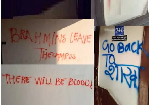 இந்த நிலையில் கடந்த சில நாட்களுக்கு முன்னதாக . ஜேஎன்யூ வளாகச் சுவற்றிலும் ஆசிரியர்களின் அறை வாசலிலும் எழுதப்பட்டிருந்த வாசகங்கள் சமூக வலைதளங்களில் வைரலாகின. அதில் ஷாகாவுக்குத் (ஆர்எஸ்எஸ் பயிற்சி முகாம்) திரும்பிச் செல்லுங்கள், ஜேஎன்யூ வளாகத்தை விட்டு பிராமணர்கள் வெளியேறுங்கள், பிராமணர்கள் - பனியாக்களே உங்களைத் தேடி வருகிறோம், ரத்தம் நிச்சயம் இருக்கும் என்பன உள்ளிட்ட வாசகங்கள் சிவப்பு நிறத்தில் எழுதப்பட்டிருந்தன.