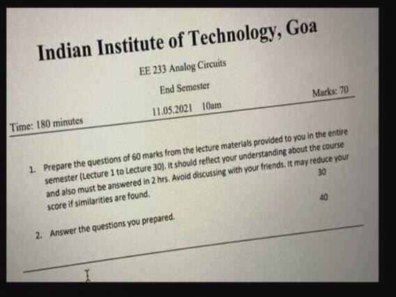 எப்படி தெரியுமா? ANALOG CIRCUITS என்ற பாடத்திற்கான இறுதி செமஸ்டர் தேர்விற்கு உயர்கல்வி பேராசிரியர்கள் ஒரு வினாத்தாளை அனுப்பியுள்ளனர். அதில் இதுவரை கொடுக்கப்பட்டுள்ள பாடத்திட்டங்களை கொண்டு (study meterials) மாணவர்கள் நீங்களே கேள்விகளை 70 மதிப்பெண்களுக்கு தயாரிக்குமாறு கூறியுள்ளனர். மேலும் நீங்கள் தயாரித்த கேள்விகளுக்கு பின்னர் 2 மணி நேரத்தில் அதற்கான பதிலை எழுதுங்கள் என சொல்லியுள்ளனர். இதோடு மட்டுமின்றி உங்களது நண்பர்களுடன் செமஸ்டருக்கான கேள்விகள் தயாரிப்பது குறித்து கலந்தாலோசிக்க கூடாது எனவும், ஒரு வேளை ஒரே மாதிரியான கேள்விகள் இருந்தால் மதிப்பெண்கள் குறைக்கப்படும் என கோவா ஐஐடி பேராசிரியர்கள் எச்சரித்துள்ளனர். இந்த முறை மாணவர்களுக்கு ஷாக் அளிக்கும் விஷயமாக இருந்தாலும், அவர்களின் கல்வி அறிவினை வளர்க்கும் விதமாக அமைந்துள்ளது என சமூக வலைத்தளங்களில் பாராட்டுக்கள் குவிந்து வருகிறது.