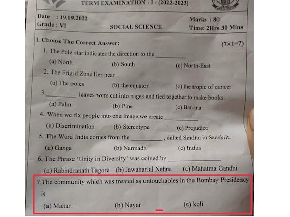 இந்த கேள்வித் தாளில் மும்பை மாகாணத்தில் தீண்டத்தகாத சாதியாக இருந்தது எது என்று கேள்வி எழுப்பப்பட்டுள்ளது. இது சர்ச்சையை ஏற்படுத்தி உள்ளது.