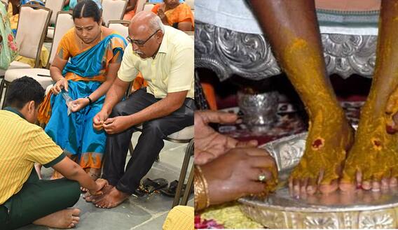பாரம்பரிய வழக்கப்படி, மகன்களும் மகள்களும் தங்களின் பெற்றோருக்கு திருமணத்தின்போது பாத பூஜை செய்வது வழக்கம். இதன்படி, தாய், தந்தையரின் கால்களில் நீர் ஊற்றிக் கழுவி, பூக்களைத் தூவி, திருநீறு, குங்குமம் பூசி வழிபாடு செய்வர்.