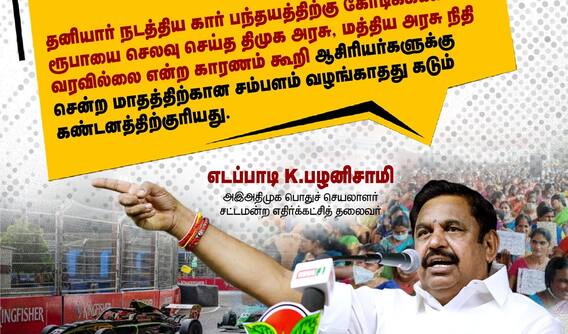 தனியார் நடத்திய கார் பந்தயத்திற்கு கோடிக்கணக்கான ரூபாயை செலவு செய்த முதல்வர் ஸ்டாலின் தலைமையிலான திமுக அரசு, மத்திய அரசு நிதி வரவில்லை என்ற காரணம் கூறி ஆசிரியர்களுக்கு சென்ற மாதத்திற்கான சம்பளம் வழங்காதது கடும் கண்டனத்திற்குரியது.