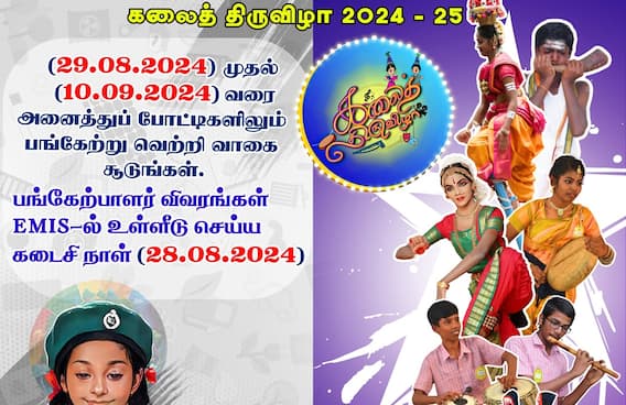 1 முதல் 12ஆம் வகுப்பு வரையிலான அரசுப் பள்ளி மாணவர்களுக்கு கலை சார்ந்த போட்டிகள், கலைத் திருவிழா என்ற பெயரில் நடத்தப்பட உள்ளன. இதற்கு விண்ணப்பிக்க நாளை (ஆக.28) கடைசித் தேதி ஆகும்.
