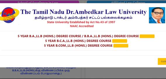 தமிழ்நாடு அம்பேத்கர் சட்டப் பல்கலைக்கழகத்தில், பி.ஏ. எல்எல்பி ஹானர்ஸ்பி.பி.ஏ. எல்எல்பி ஹானர்ஸ்பி.காம். எல்எல்பி ஹானர்ஸ்பி.சி.ஏ. எல்எல்பி ஹானர்ஸ் உள்ளிட்ட படிப்புகள் வழங்கப்படுகின்றன. இதற்கு மாணவர்கள் மே 31ஆம் தேதி வரை விண்ணப்பிக்கலாம் என்று அறிவிக்கப்பட்ட நிலையில், விண்ணப்பப் பதிவு மே 10ஆம் தேதி முதல் தொடங்கி நடைபெற்று வருகிறது.