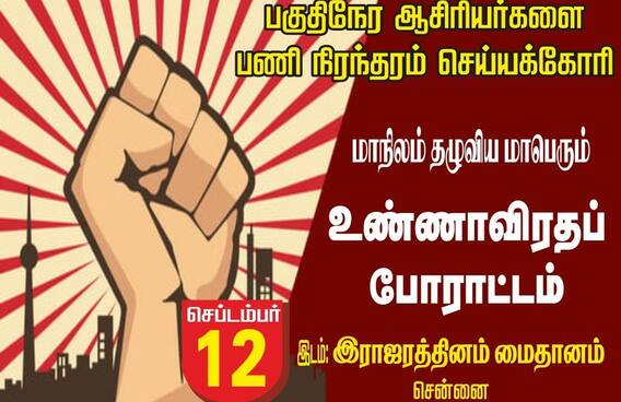 திமுக சட்டமன்ற தேர்தல் வாக்குறுதி 181-ன் படி பகுதிநேர ஆசிரியர்களின் பணி நிரந்தரக் கோரிக்கையை நிறைவேற்றக்கோரி உண்ணாநிலைப் போராட்டம் என்று பகுதிநேர ஆசிரியர் சங்கங்களின் ஒருங்கிணைப்புக் குழு ஒருங்கிணைப்பாளர்கள் அறிவித்துள்ளனர்.