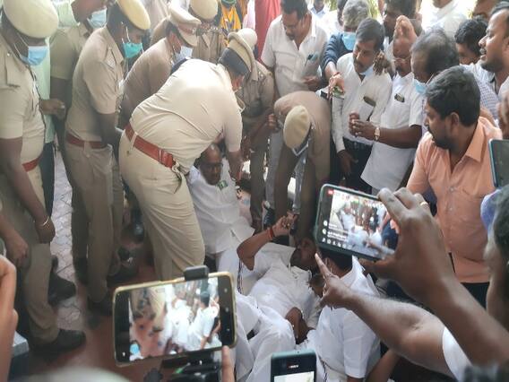 இதனிடையே அதிகாரிகள் நடத்திய பேச்சுவார்த்தைகள் தோல்வியில் முடிவடைந்த நிலையில், அதிமுகவினர் போராட்டம் 4 மணி நேரத்திற்கும் மேலாக நடைபெற்றது. இதையடுத்து காவல் துறையினர் போராட்டத்தில் ஈடுபட்ட அதிமுகவினரை கைது செய்ய முயன்றனர். அதற்கு எதிர்ப்பு தெரிவித்து அதிமுகவினர் முழக்கங்களை எழுப்பியதால் இரு தரப்பினர் இடையே கடும் தள்ளுமுள்ளு ஏற்பட்டது.