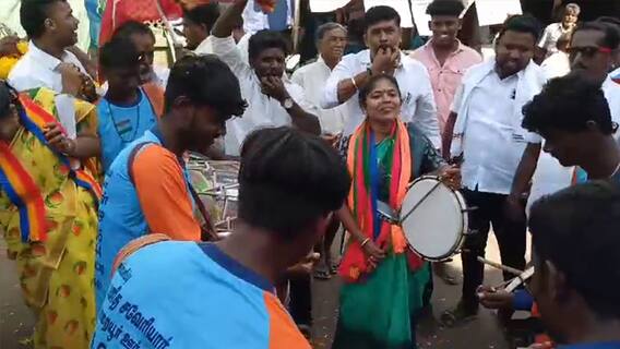 திண்டுக்கல் கோவிந்தாபுரம் பகுதியில் பாட்டாளி மக்கள் கட்சி வேட்பாளர் திலகபாமா பறை இசைத்தும் நடனமாடியும் வாக்கு சேகரித்தார், கூடி நின்ற தொண்டர்கள் மலர்த்துவியும் விசில் அடித்தும் ஆரவாரம் செய்தனர்.