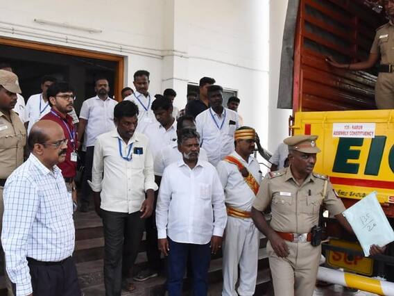 கரூரில் உள்ள வாக்குச்சாவடிகளுக்கு வாகனங்கள் மூலம் வாக்கு இயந்திரங்களை போலீஸ் பாதுகாப்புடன் கொண்டு செல்லும் பணி தீவிரமாக நடைபெற்று வருகிறது.