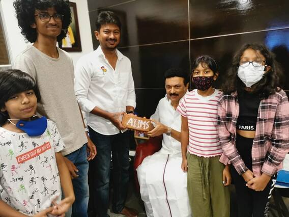 திமுக தலைவர் ஸ்டாலினை நேரில் சந்தித்த உதயநிதி ஸ்டாலின் அவருக்கு AIIMS என்று எழுதப்பட்ட செங்கல்லை பரிசாக வழங்கினார்.