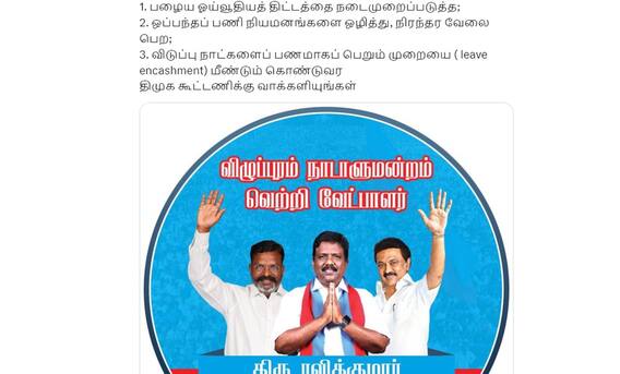- விடுப்பு நாட்களைப் பணமாகப் பெறும் முறையை ( leave encashment ) மீண்டும் கொண்டுவர திமுக கூட்டணிக்கு வாக்களியுங்கள் என்று தெரிவித்துள்ளார்.