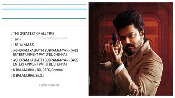 இந்த சூழலில், கோட் படம் எத்தனை நிமிடங்கள் என்ற தகவல் வெளியாகியுள்ளது. சென்சார் போர்ட் தி கோட் படத்திற்கு அளித்துள்ள தணிக்கைச் சான்றிதழ் தற்போது இணையத்தில் வைரலாகி வருகிறது. அதன்படி. கோட் படம் மொத்தம் 183 நிமிடங்கள் 14 நொடிகள் ஓடுகிறது. அதாவது, 3 மணி நேரம் மொத்த படமும் ஓடுகிறது.
