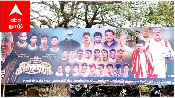 மயிலாடுதுறை மாவட்டம் சீர்காழியில் விடாமுயற்சி திரைப்படம் திரையிடப்பட்ட திரையரங்கு முன்பு படத்திற்காக அஜித் ரசிகர்கள் வைத்துள்ள பேனர் பலரது கவனத்தை ஈர்த்துள்ளது.