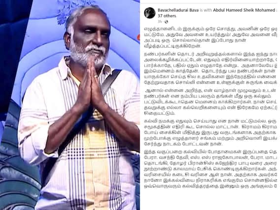 பிக் பாஸ் சீசன் 7 தமிழில் போட்டியாளராக கலந்துகொண்ட எழுத்தாளர் பவா செல்லத்துரை (Bava Chelladurai) கல்வி குறித்து நிகழ்ச்சியில் சொன்ன கருத்துக்கு பல்வேறு விமர்சனங்கள் சமூக வலைதளங்களில் எழுந்ததைத் தொடர்ந்து தற்போது தன் சார்பில் மிக நீண்ட விளக்கம் ஒன்றை அளித்துள்ளார்.