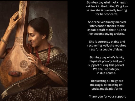 பாம்பே ஜெயஸ்ரீ-க்கு ஓய்வு தேவை என்று மருத்துவர்கள் அறிவுறுத்தியுள்ளதால், அவருக்கும் அவரது குடும்பத்தினருக்கும் தேவையான தனிப்பட்ட நேரத்தை வழங்குமாறும் போஸ்டில் கேட்டுக்கொள்ளப்பட்டுள்ளது. சமூக வலைதளங்களில் பரவி வரும் தகவல்களை நம்ப வேண்டாம் என்றும் ரசிகர்களுக்கு தெரிவிக்கப்பட்டுள்ளது.