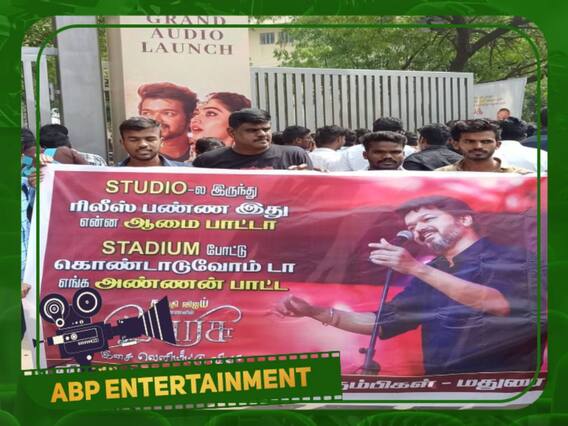 மிகவும் ஆர்வமாக நடைபெற்றுவரும் இந்த நிகழ்ச்சியில் சில பரபரப்பு ஏற்படுத்தும் விஷயங்கள் நடைபெற்றுள்ளன. சமீபத்தில் நடிகர் விஜய் தனது ரசிகர்களை சந்தித்து பேசியபோது அநாகரீகமான வார்த்தைகளை பயன்படுத்தி போஸ்டர்கள் பேனர்கள் வைக்கக்கூடாது என கூறியதாக சொல்லப்பட்டது. ஆனால் இதனையும் பொருட்படுத்தாமல் விஜய் ரசிகர்கள் பல சர்ச்சையை கிளப்பும் பேனர்களை இசை வெளியீட்டு விழா நடக்கும் நேரு உள்விளையாட்டு அரங்கத்தின் வெளியே பிடித்துக்கொண்டு இருப்பது பெரும் சலசலப்பை ஏற்படுத்தியுள்ளது.