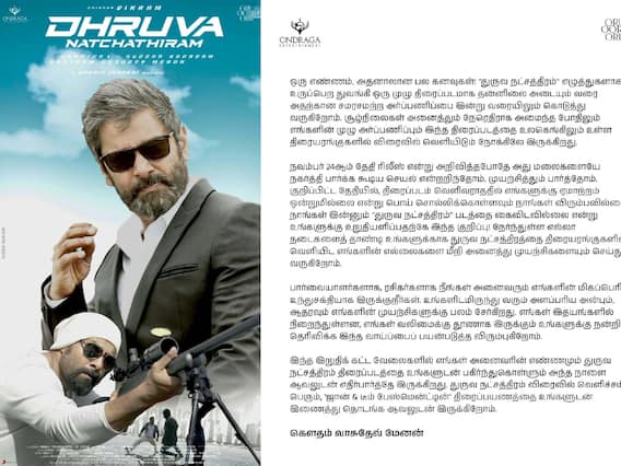 கெளதம் மேனன் இயக்கத்தில் விக்ரம் நடித்துள்ள 'துருவ நட்சத்திரம்' திரைப்படம் கடந்த நவம்பர் 24ஆம் தேதி வெளியாக இருந்த நிலையில், தற்போது கால வரையின்றி ஒத்திவைக்கப்பட்டுள்ளது. விக்ரம், ரிதுவர்மா, ஆர்.பாத்திபன் , ராதிகா சரத்குமார், திவ்யதர்ஷினி, விநாயகன், சதீஷ் கிருஷ்ணன், சலீம் பெய்க், ஷ்ரவந்தி சாய்நாத், மாயா கிருஷ்ணன், முன்னா சிமோன், வம்சி கிருஷ்ணா, சுரேஷ் மேனன் உள்ளிட்டவர்கள் இப்படத்தில் நடித்துள்ளார்கள். ஹாரிஸ் ஜெயராஜ் இந்தப் படத்திற்கு இசையமைத்துள்ளார்.
