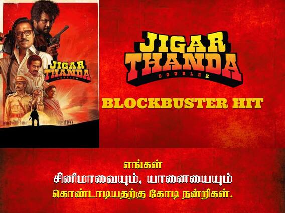 தற்போது ஜிகர்தண்டா படம் ப்ளாக்பஸ்டர் ஹிட் ஆக அறிவிக்கப்பட்டு, இதற்காக சிறப்பு வீடியோ ஒன்றையும் வெளியிட்டுள்ளது படக்குழு. சினிமாவையும் யானைகளையும் ஒப்பிட்டு இந்த வீடியோ அமைந்துள்ளது . இறுதியில் “ எங்கள் சினிமாவையும் யானைகளையும் கொண்டாடியதற்கு நன்றி” என்று படக்குழு சார்பில் தெரிவிக்கப் பட்டுள்ளது.