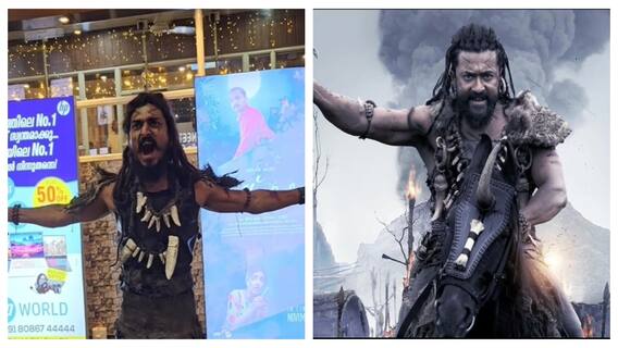 சூர்யா இந்த படத்தில் 700 ஆண்டுகளுக்கு முந்தைய பழங்கால தமிழராக நடித்துள்ளார். கேரளாவில் கங்குவா படம் வெளியான திரையரங்கில் ரசிகர் ஒருவர் கங்குவா கெட்டப்பில் படம் பார்க்க வந்துள்ளார். கங்குவா கெட்டப்பில் படம் பார்க்க வந்தது மட்டுமின்றி கங்குவா படத்தில் சூர்யா பேசும் வசனமான உன் ரத்தமும் என் ரத்தமும் வெவ்வேறா? எதிர்கொள்வோம். எதிரி கொல்வோம்” என்ற வசனத்தையும் பேசுகிறார்.