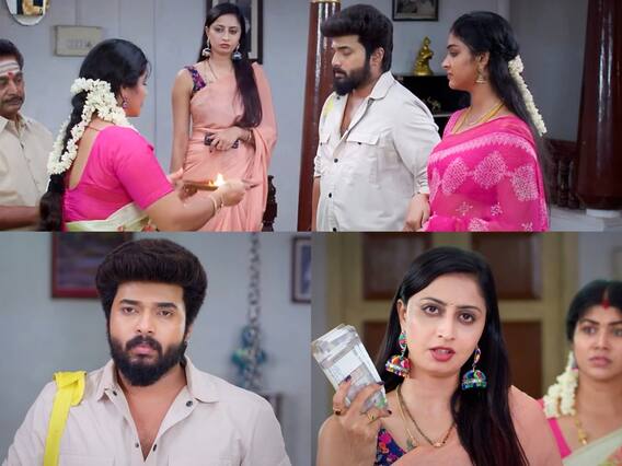 அதனைத் தொடர்ந்து ஐஸ்வர்யா வெளியே வரும்போது, தர்மலிங்கத்திடம் பணம் கொடுத்தவர் வந்து ஒரு லட்சம் ரூபாய் பணத்தை திருப்பி கேட்க, “அவர் பொண்ணு, மாப்பிளை மறு வீட்டிற்காக வந்திருக்காங்க, நான் கூடிய சீக்கிரம் பணத்தை கொடுத்து விடுகிறேன்” என தர்மலிங்கம் பேசிக் கொண்டிருக்கிறார்.