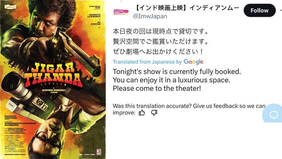 ஜிகர்தண்டா படம் வெளியாகி கிட்டதட்ட 6 மாதங்கள் கடந்துள்ள நிலையில் இப்படம் ஜப்பன் திரையரங்கில் ஹவுஸ் ஃபுல்லாக ஓடிக் கொண்டிருப்பதாக இயக்குநர் கார்த்திக் சுப்பராஜ் தனது எக்ஸ் பக்கத்தில் பகிர்ந்துள்ளார். ஜப்பான் ரசிகர்களிடம் எப்போது தமிழ் படங்களுக்கு குறிப்பாக ரஜினிகாந்த் படங்களுக்கு சிறப்பான வரவேற்பு இருந்து வருகிறது . ரஜினிகாந்த் தவிர்த்து அடுத்தபடியாக விஜய் படங்களும் ஜப்பானில் கவனம் பெற்று வருகின்றன. இப்படியான சூழலில் பிற நடிகர்களின் படங்களும் ஜப்பானில் ஓடுவது அதுவும் ஹவுஸ் ஃபுல்லாவது என்பது ஒரு சில நல்ல தமிழ் படங்களுக்கு கிடைக்கும் மிகப்பெரிய மரியாதையே.