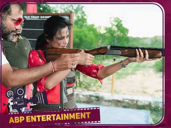 நடிகை ரம்யா பாண்டியன் ரைஃபிள் ஷூட்டிங்கில் ஈடுபட்டு இருக்கிறார்.