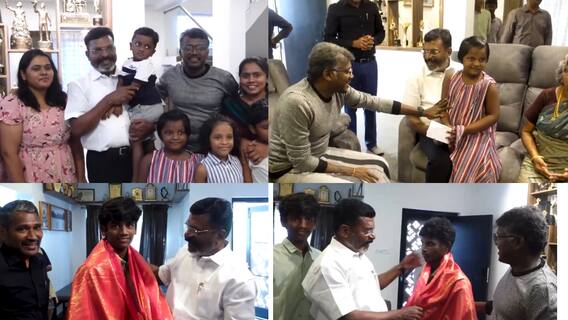 படம் பார்த்து முடித்து மாரி செல்வராஜை கட்டிபிடித்து முத்தம் கொடுப்பது என்பது ஒரு சடங்காக மாறும் அளவிற்கு அவருக்கு பாராட்டுக்கள் குவிந்து வருகின்றன. இப்படியான நிலையில் வாழை படத்தை பார்வையிட்ட விடுதலை சிறுத்தைக் கட்சித் தலைவர் தொல்.திருமாவளவன் மாரி செல்வராஜின் வீட்டிற்கே சென்று அவரை பாராட்டியுள்ளார். மாரி செல்வராஜின் அன்னை, படத்தில் நடித்த பொன்வேல் மற்றும் ராகுல் ஆகிய இருவர் பொன்னாடை போர்த்தி திருமா கெளரவித்தும் உள்ளார்.
