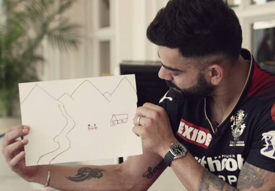 உடனடியாக வரைவதில் ஈடுபட்ட விராட் கோஹ்லி, மலைகளையும், ஆறு ஒன்றையும், அதன் கரையோரம் சிறிய வீடு, அதோடு மூன்று மனிதர்களையும் வரைந்து அதனை விவரித்துள்ளார். `இது நாங்கள் மூவர்.. ஏதோ ஒரு மலை அடிவாரத்தில், ஆற்றின் ஓரத்தில் உள்ள வீடு இது’ என விராட் கோஹ்லி கூறியுள்ளார்.