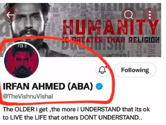 இந்த சர்ச்சைகளுக்கு இடையில்தான், ட்விட்டர் ஹேண்டிலில் தனது பெயரை இர்ஃபான் அகமது என மாற்றியுள்ளார் நடிகர் விஷ்ணு விஷால்.
