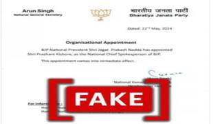 கடந்த 2014 ஆம் ஆண்டு தேர்தல் பிரச்சாரத்தின்போது பாஜகவுடன் இணைந்து பணியாற்றியவர் பிரசாந்த் கிஷோர். 2024 தேர்தலில் பாஜக வெற்றி பெறும் என்று கணித்துள்ளார். இச்சூழலில்தான், பாஜக தேசிய தலைமை செய்தித் தொடர்பாளராக அவர் நியமிக்கப்பட்டதாக தகவல் பரவி வருகிறது. ஆனால், அதில் உண்மை இல்லை. ஏமாற்றும் வகையில் அந்த செய்திக்குறிப்பு பரப்பப்பட்டு வருகிறது.