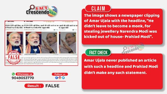 சமீபத்தில், செய்தி ஒன்று சமூக வலைதளத்தில் வைரலானது. Amar Ujala செய்தி நிறுவனத்தின் துண்டு செய்தியில் பிரதமர் மோடியின் சகோதரர் பிரகலாத் மோடி பேசியதாக சில தகவல்கள் மேற்கொள் காட்டப்பட்டிருந்தது. அதில், "துறவியாவதற்காக அவர் வீட்டில் இருந்து வெளியேறவில்லை. நகைகளை திருடியதற்காக வீட்டை விட்டு வெளியேற்றப்பட்டவர்தான் நரேந்திர மோடி" என மோடியின் சகோதரர் கூறியதாக குறிப்பிடப்பட்டிருந்தது.