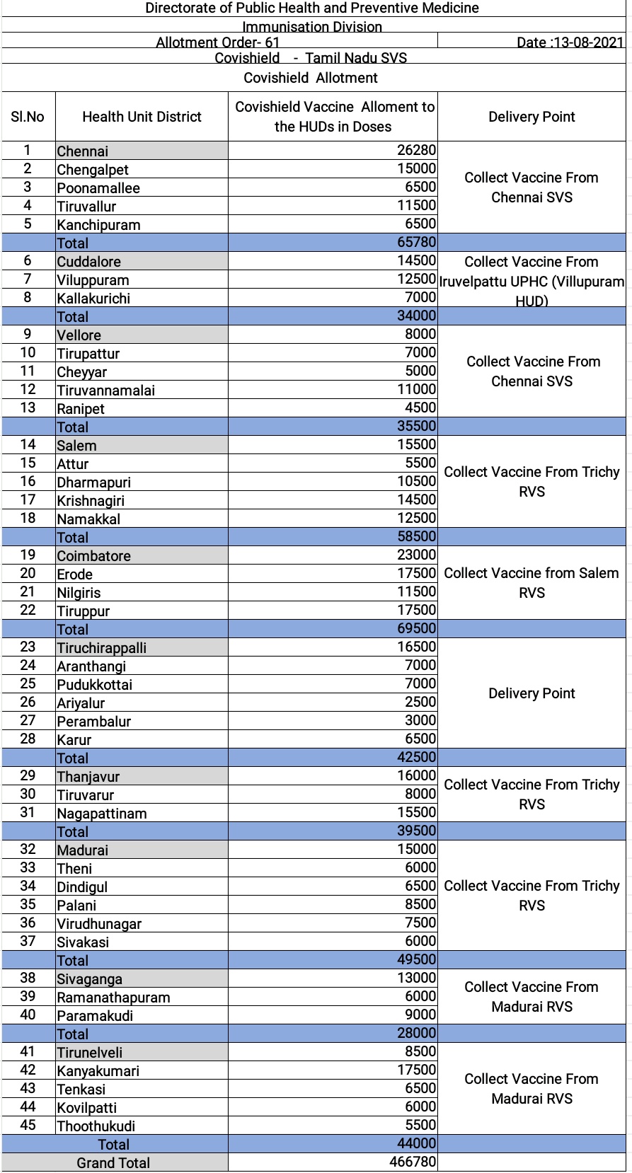 தமிழகத்திற்கு நேற்று வந்துள்ள தடுப்பூசிகள் மாவட்ட வாரியாக ஒதுக்கீடு விவரம்: