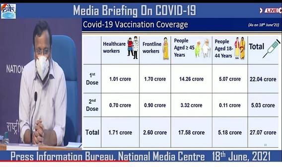 நாட்டில் கொரோனா தொற்று பாதிப்பு தொடர்பாக விளக்கிய அவர், இந்தியாவின் இரண்டாம் அலை கொரோனா தினசரி பாதிப்பு எண்ணிக்கைக் குறைந்து வருகிறது. தினசரி பாதிப்பு எண்ணிக்கையின் சராசரியும் குறைந்து வருகிறது. இது கடந்த வாரத்தில் மட்டும் 30 சதவிகிதம் வரைக் குறைந்துள்ளது. அதிக கொரோனா பாதிப்புப் புகார்கள் பதிவான மாவட்டங்களின் எண்ணிக்கையும் குறைந்து வருகிறது. கொரோனா பாதிக்கப்பட்டு சிகிச்சை பெற்றுவரும் நபர்களின் எண்ணிக்கையும் குறைந்துள்ளது. நாடு முழுவதும் கொரொனா பாதிப்பிலிருந்து சிகிச்சை பெற்று மீண்டவர்களின் எண்ணிக்கை அதிகரித்துள்ளது. 7 மே 2021 அன்று உச்சத்தைத் தொட்ட நாட்டின் கொரோனா பாதிப்பு எண்ணிக்கை அதன்பிறகு கணிசமாகக் குறைந்து வருகிறது. இது கிட்டத்தட்ட 85 சதவிகிதம் வரைக் குறைந்துள்ளது. 3 மே 2021-க்கு பிறகான கொரொனா பாதிப்பிலிருந்து மீண்டவர்களின் எண்ணிக்கை 81.8 சதவிகிதத்திலிருந்து 96 சதவிகிதம் வரை அதிகரித்துள்ளது. அதே சமயம் கொரோனா பாதிப்பு பரிசோதனையும் தொடர்ச்சியாக மேற்கொள்ளப்பட்டு வருகிறது’ எனக் குறிப்பிட்டார்.