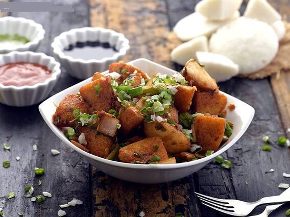 வானலியில் ரீஃபைன்ட் ஆயில் சற்று அதிகாமகவே ஊற்றி சூடாக்கவும். எண்ணெய் குறைவாக ஊற்றினால் இட்லி பாத்திரத்தில் ஒட்டிக் கொள்ளும். ஆகையால் இட்லி மூழ்கும் அளவிற்கு தண்ணீர் ஊற்றிக் கொள்ளுங்கள். 4 இட்லிகளையும் சற்று சிறு துண்டுகளாக, வெட்டிக் கொள்ளுங்கள். பின்னர் அதனை எண்ணெய்யில் போட்டு பொரித்துக் கொள்ளுங்கள். பொரித்த இட்லிகளை டிஸ்யூ பேப்பர் மீது போட்டு தனியாக வைத்துவிடுங்கள். பின்னர் ஒரு வானலியில் வெறும் இரண்டும் டீச்பூன் மட்டும் எண்ணெய் ஊற்றி அதில் 4 பல் பூண்டை பொடியாக வெட்டி சேர்க்கவும்.