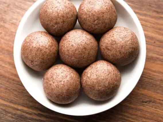 செய்முறை வாய் அகன்ற பாத்திரத்தில் சிறிதளவு தண்ணீர் ஊற்றி தூளாக்கிய வெல்லத்தை கொட்டி பாகு காய்ச்சி வடிகட்டி எடுத்துக் கொள்ள வேண்டும். கடாயில் எள்ளை கொட்டி மிதமான தீயில் லேசாக வறுத்து எடுத்துக் கொள்ள வேண்டும். நெய்யில் முந்திரி பருப்பு, உலர் திராட்சையை வறுத்து எடுத்து வைத்துக் கொள்ள வேண்டும். கேழ்வரகு மாவையும் வாசனை வரும் வரை தீயாமல் வறுத்தெடுக்க வேண்டும். வறுத்த மாவை வெல்ல பாகில் கொட்ட வேண்டும். உலர் திராட்சை, எள், முந்திரி பருப்பு, ஏலக்காய் தூள், சுக்கு தூள் ஆகியவற்றையும் அதனுடன் கொட்டி கிளறி இறக்க வேண்டும். சற்று சூடு ஆறியதும், இவற்றை கைகளால் பிடிக்க முடிந்த சூட்டில் லட்டுகளாக பிடித்து எடுத்துக் கொள்ள வேண்டும். அவ்வளவுதான் சத்தான, சுவையான ராகி லட்டு தயார்.