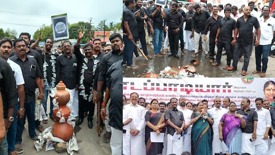 இதேபோன்று போராட்டத்திற்கு வந்திருந்த அதிமுகவினர் சாராய பானையைப் போராட்டத்திற்கு கொண்டு வந்து அதை அடித்து நொறுக்கினர். மேலும் சாராய பாக்கெட்டுகளையும் மாளிக அணிவித்து வந்து நூதன முறையில் போராட்டத்தில் ஈடுபட்டதால் சிறிது நேரம் பரபரப்பு ஏற்பட்டது.