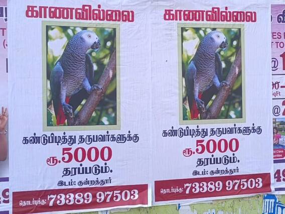 நமது வீட்டில் உள்ள ஒருவர் காணாமல் போய்விட்டால் அவரை கண்டுபிடிப்பதற்காக, பல்வேறு வழிகளை கையாளுவோம் அதில் பெரும்பாலும் அவரது படத்தை வைத்து தொலைபேசி எண்களுடன் பொதுமக்கள் அதிகம் கூடும் இடங்களில் போஸ்டராக ஒட்டுவது வழக்கம். ஆனால் காஞ்சிபுரம் மாவட்டம் குன்றத்தூரில் தான் மூன்று ஆண்டுகளாக செல்லமாக வளர்த்த ஆப்பிரிகன் நாட்டு கிரே கிளி காணாமல் போனதால் அதனை கண்டுபிடித்து தருபவர்களுக்கு ரூ.5 ஆயிரம் சன்மானம் தரப்படும் என குன்றத்தூர் முழுவதும் போஸ்டர் ஒட்டி இருப்பது பரபரப்பை ஏற்படுத்தி உள்ளது