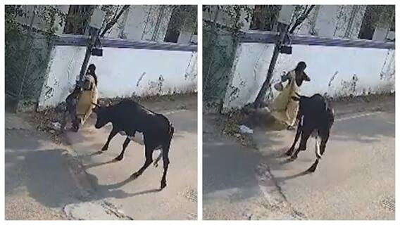இருப்பினும், பெண்ணின் பின்புறம் சென்ற அந்த மாடு சாலையின் ஓரத்தில் உள்ள சுவற்றில் தள்ளி முட்டி மோதியுள்ளது. பெண் கீழே தள்ளி தொடர்ந்து முட்டியது. இதையடுத்து, அருகில் உள்ளவர்கள் வந்து மாட்டினை குச்சியால் அடித்து விரட்டியுள்ளனர்.