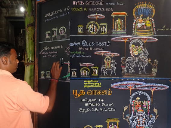அந்த வகையில், காஞ்சிபுரம் பகுதி சேர்ந்த சகோதரர்களான டில்லி பாபு மற்றும் தினேஷ் ஆகிய இருவரும், கடந்த 2008 ஆண்டு முதல் காஞ்சிபுரம் ஏகாம்பரநாதர் திருக்கோவிலில் பிரம்மோற்சவத்தின் போது தினம்தோறும் நடைபெறும் உற்சவத்தை, கரும்பலகையில் சாக்பீஸ் கொண்டு ஓவியமாக வரைந்து, ஏகாம்பரநாதர் கோவிலில் உள்ள ரிஷிகோபுரம் நுழைவாயிலில், வைப்பது வழக்கம் இந்த நிலையில் இந்த வருடம் அவ்வாறு வைக்கப்பட்ட ஓவியத்தை நேற்று அகற்றியதாக டில்லிபாபு மற்றும் தினேஷ் ஆகிய இருவர் குற்றச்சாட்டை முன் வைத்துள்ளனர்.