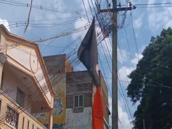 மின்சார கம்பத்தில் அருகருகே நட்டு இருத்த கட்சிக் கொடி